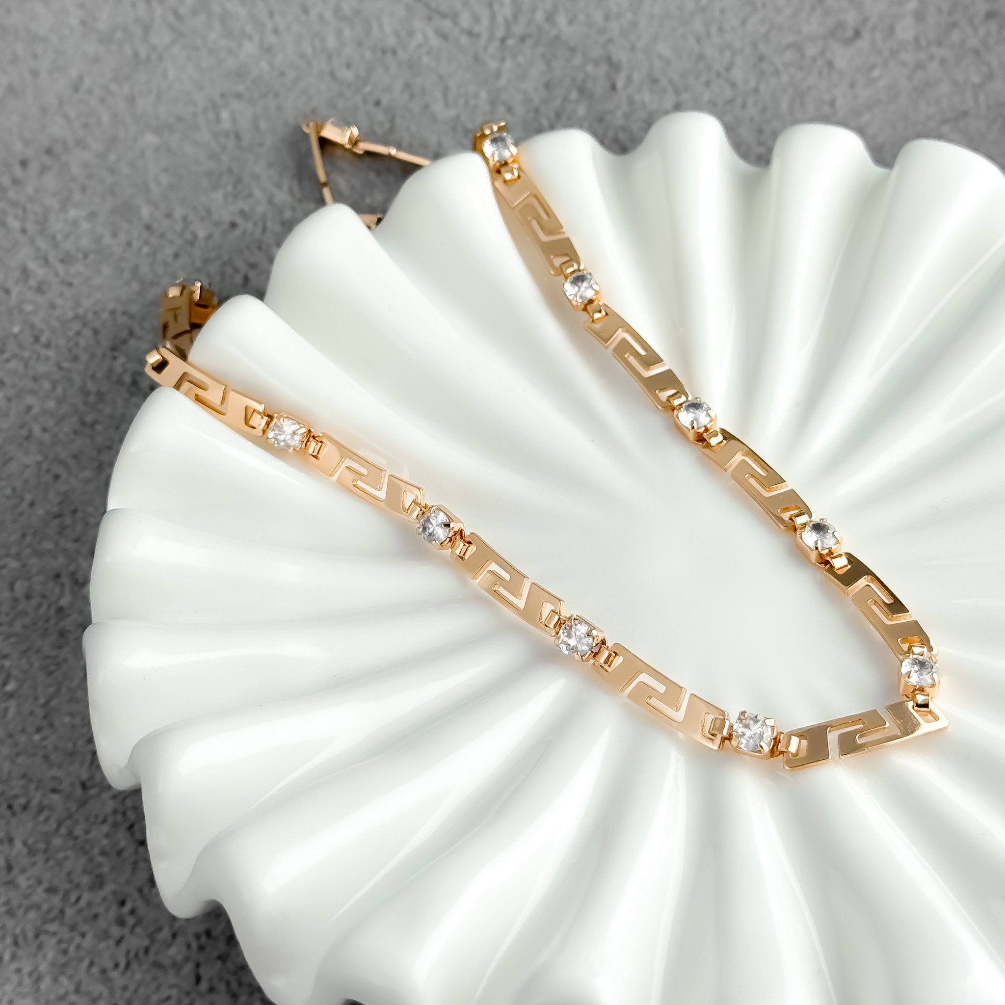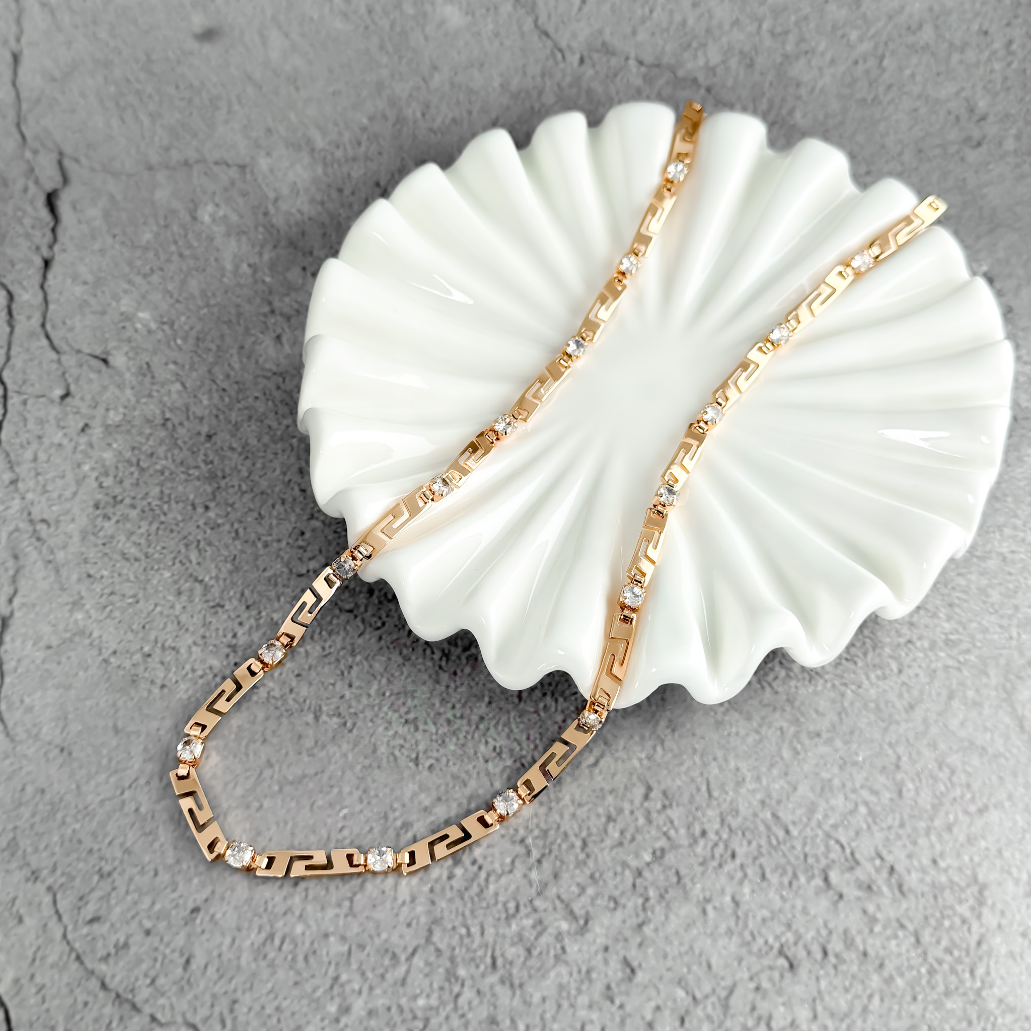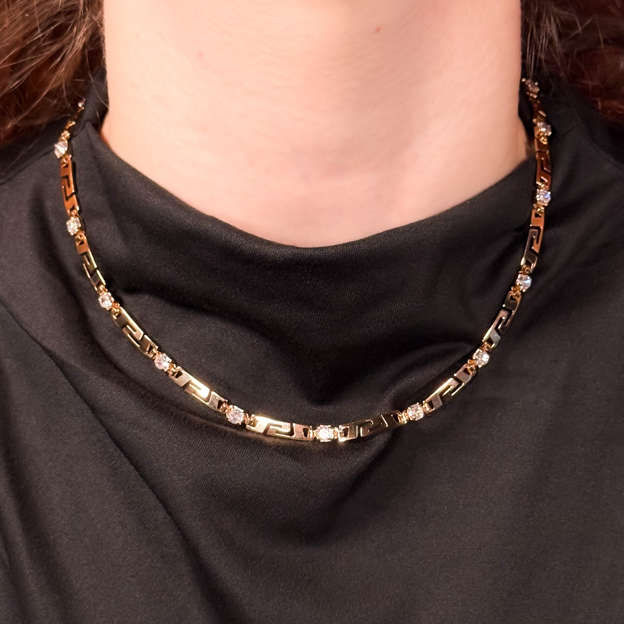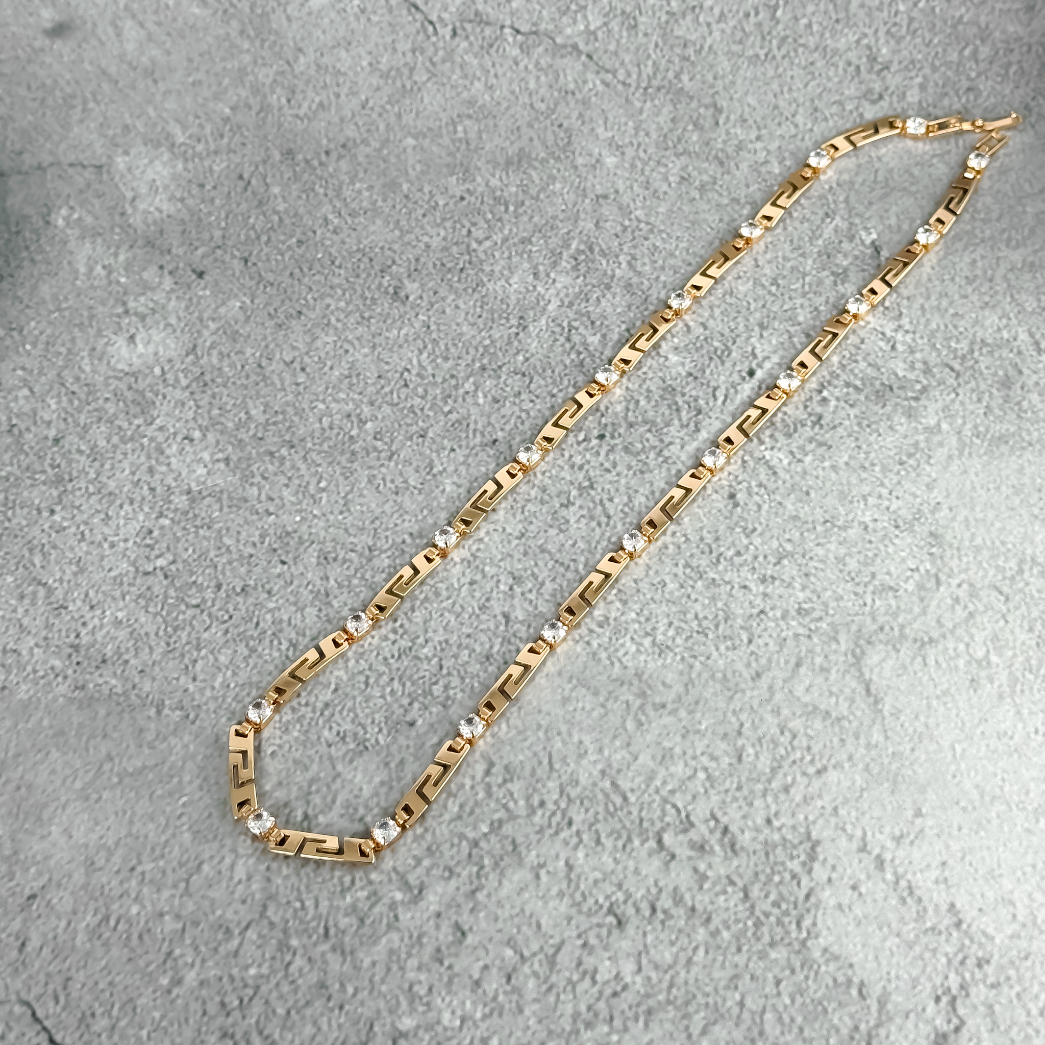 Naszyjnik, który łączy klasykę ze wzorem inspirowanym greckim ornamentem. Złota baza z geometrycznym motywem została urozmaicona przez błyszczące cyrkonie rozmieszczone rytmicznie na całej długości. Idealny do stylizacji z pazurem zarówno na co dzień, jak i wieczorem.