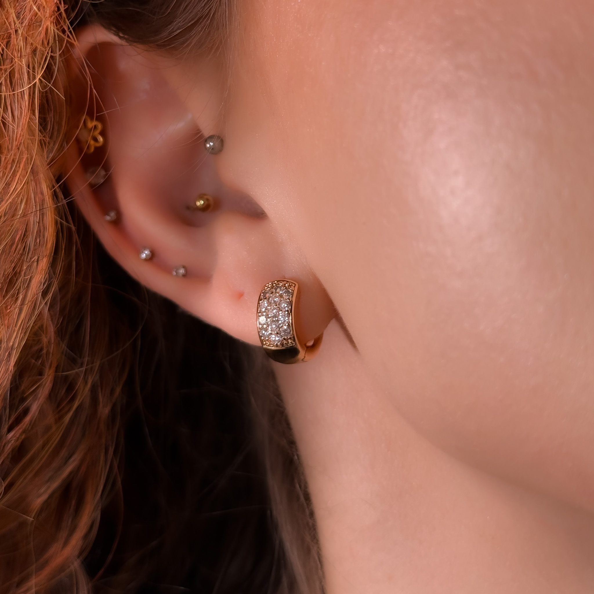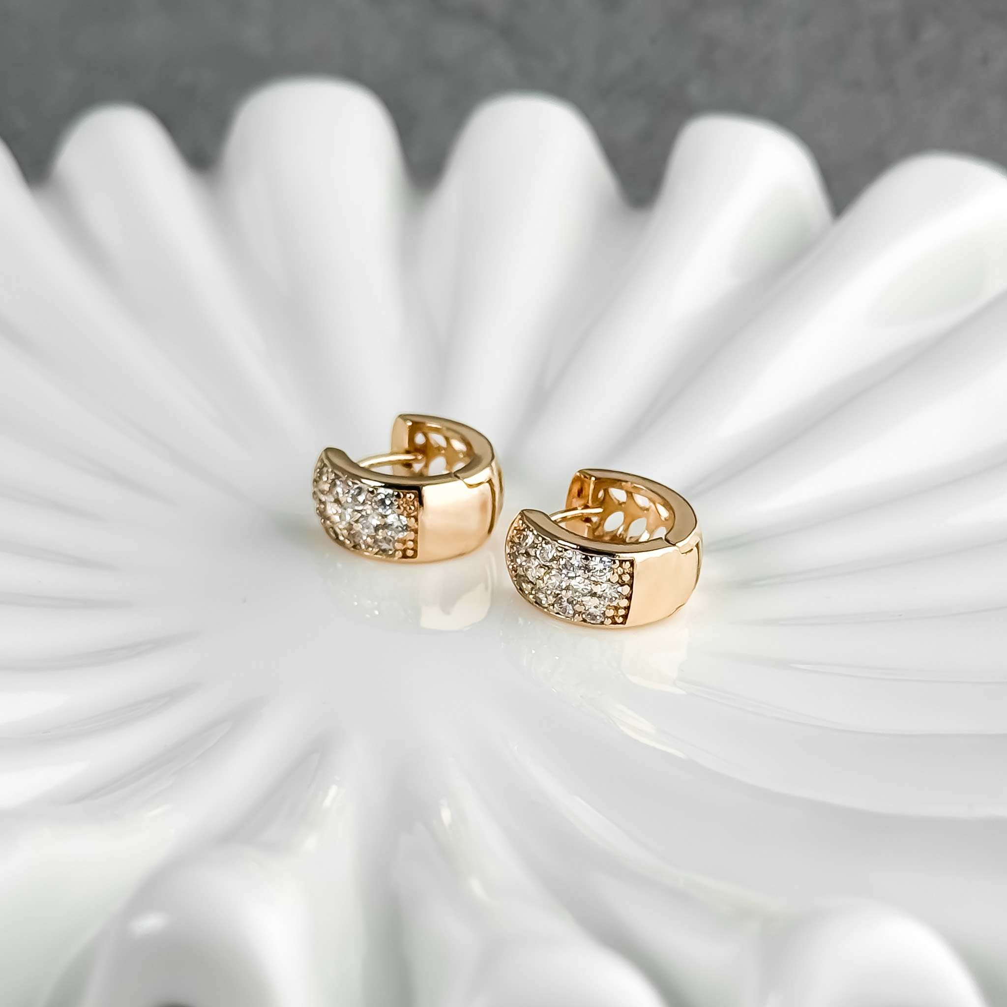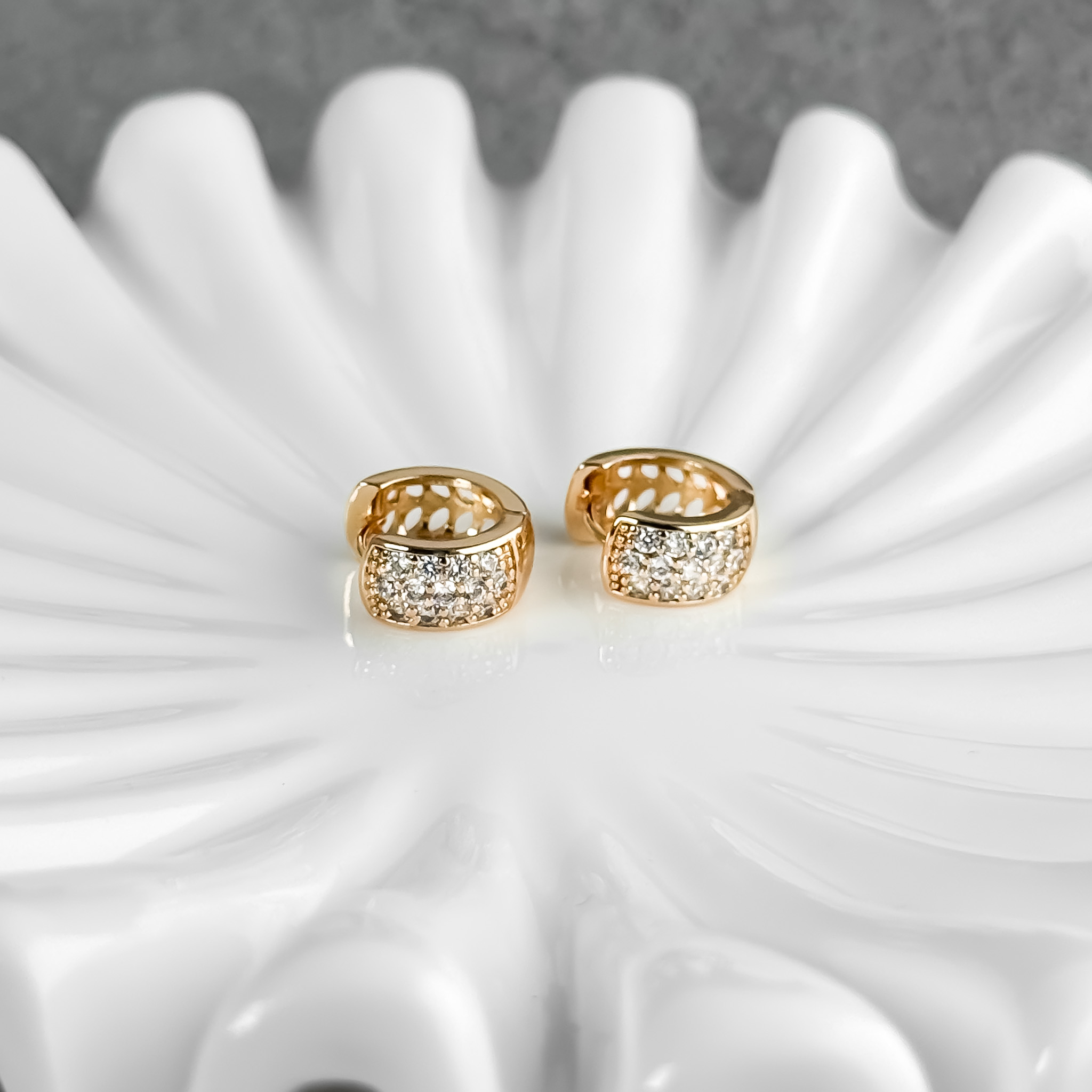 Te złote mini-kółeczka mają elegancki, masywny kształt i front wysadzany drobnymi cyrkoniami. Są pełne blasku, ale nadal subtelne, idealne na co dzień, do pracy i na wieczorne wyjścia. Pasują do wszystkiego i pięknie rozświetlają twarz.