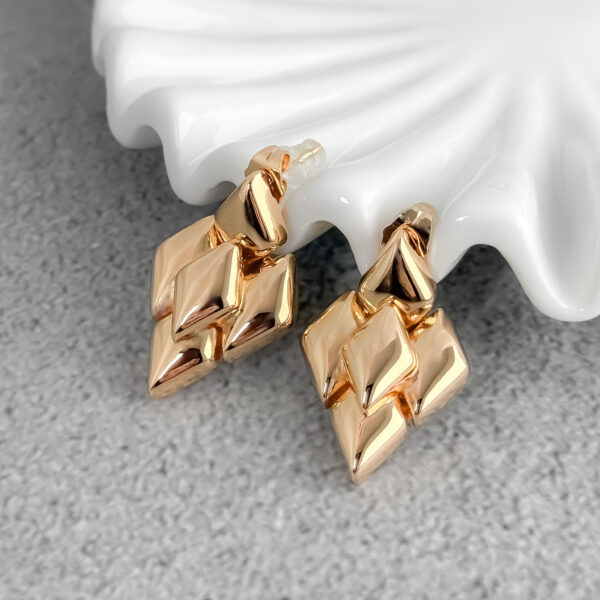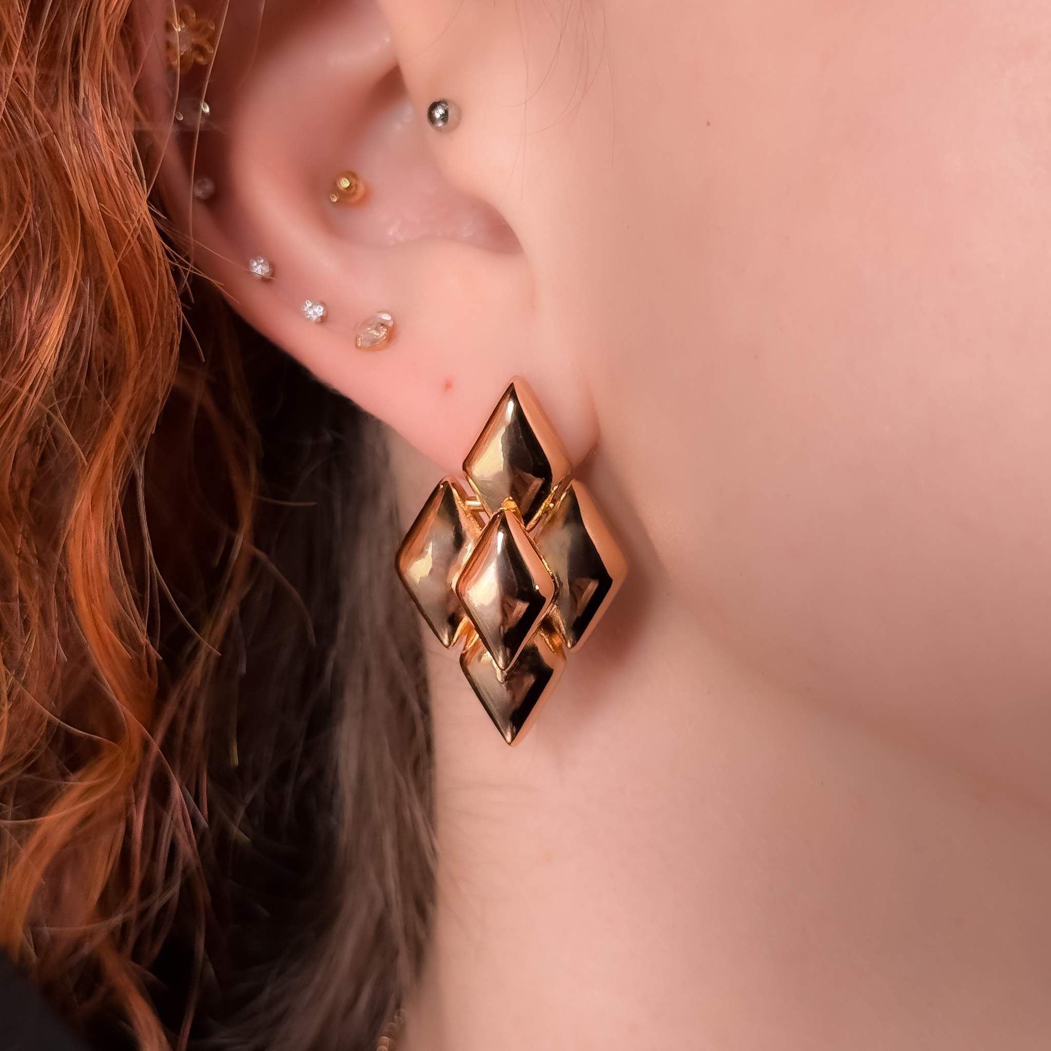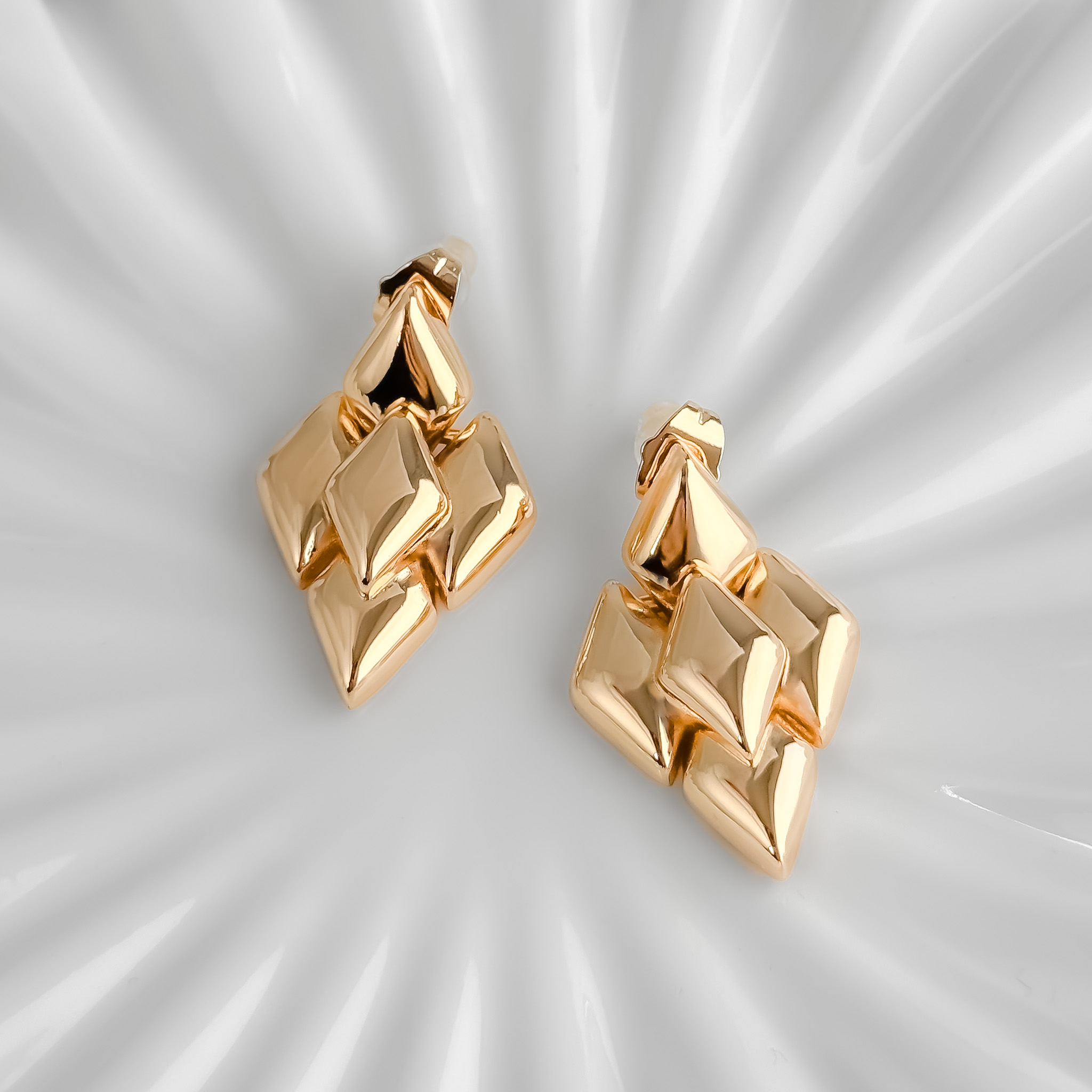 Złote kolczyki o formie pięciu połączonych rombów to biżuteria, która przyciąga wzrok i dodaje charakteru każdej stylizacji. Idealne do minimalistycznych zestawów i wieczornych looków z pazurem.