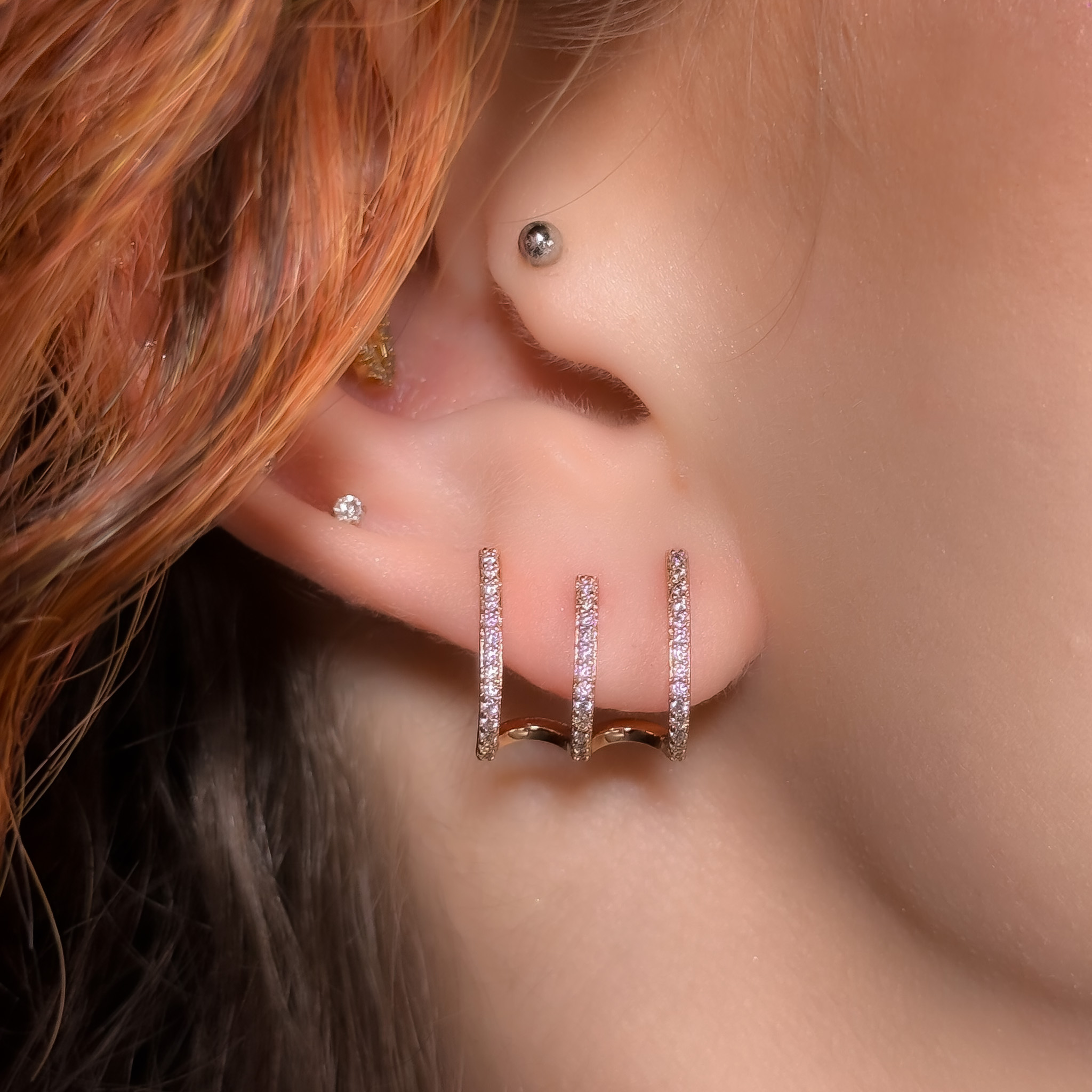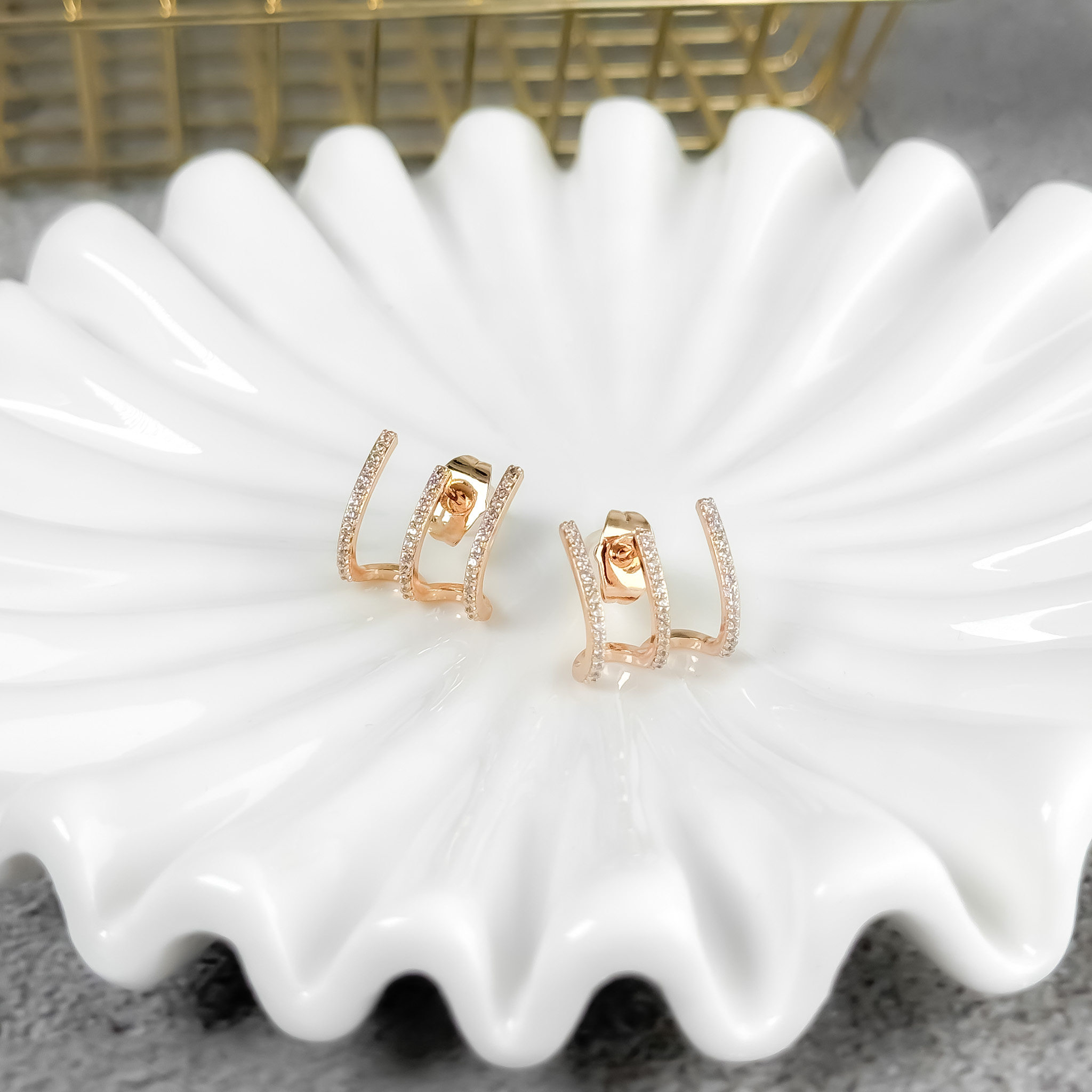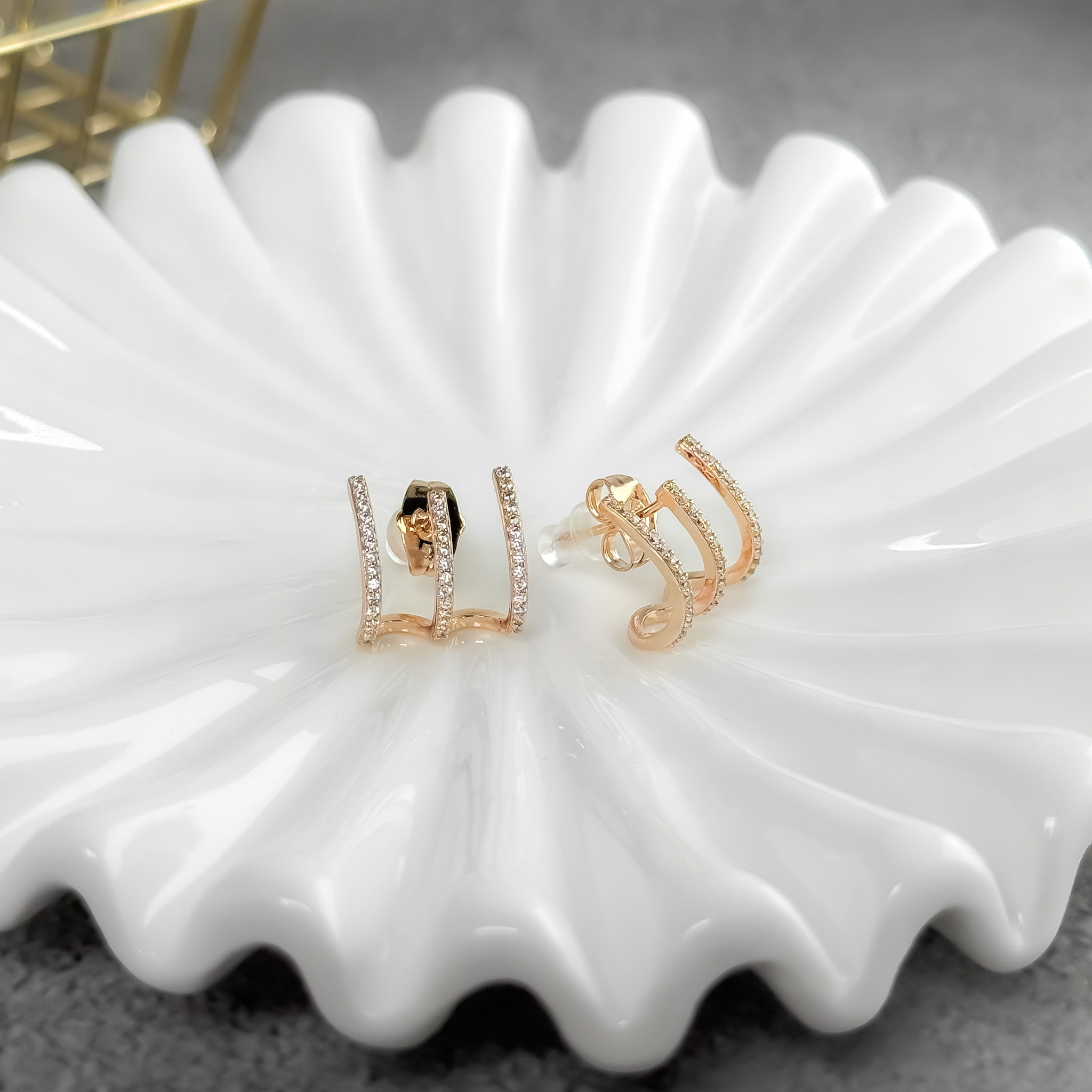 Te potrójne kolczyki tworzą efekt delikatnej, złotej klamry obsypanej drobnymi cyrkoniami. Wyglądają jak trzy cienkie obrączki ułożone w elegancki, geometryczny kształt. Subtelne, ale robią wrażenie – idealne do współczesnych, czystych stylizacji.