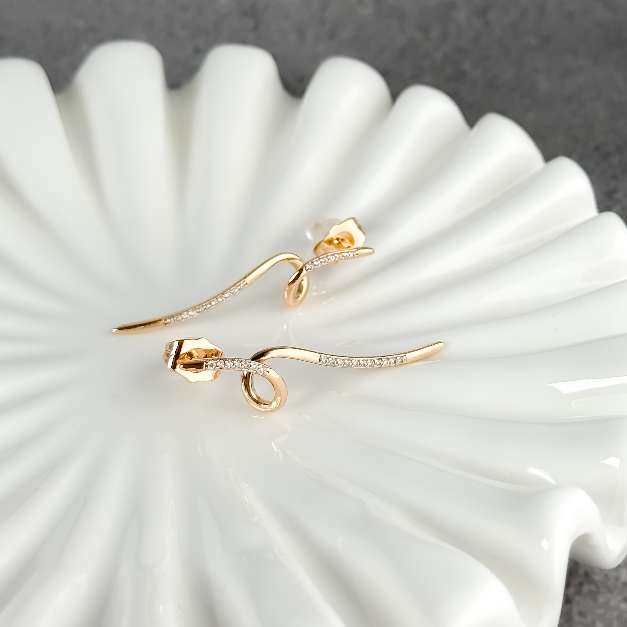 Eleganckie kolczyki o falującym kształcie, przypominającym taniec światła, subtelne, ale pełne charakteru. Delikatne cyrkonie podkreślają linię ucha i dodają im szlachetnego blasku. Doskonały wybór do minimalistycznych, kobiecych stylizacji.