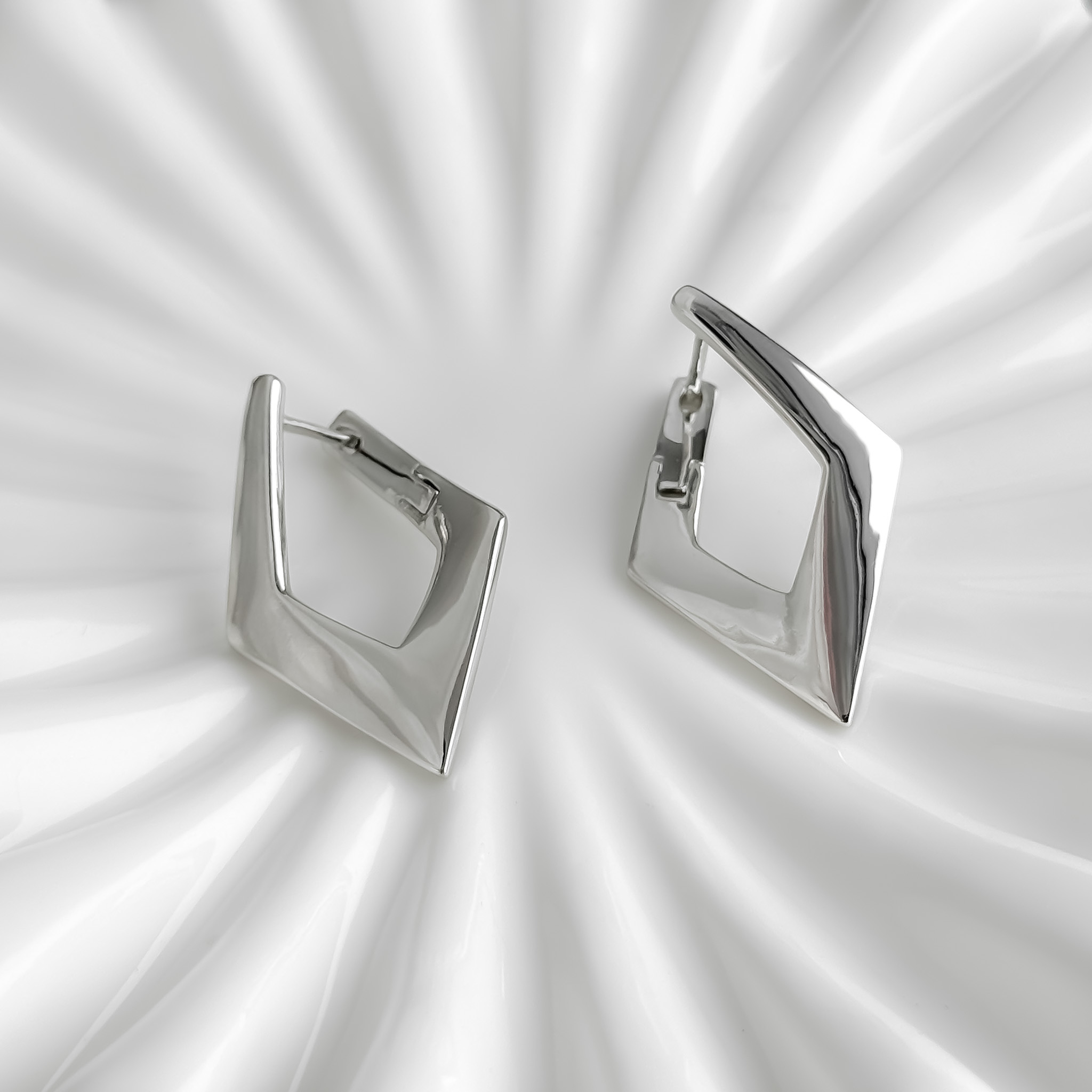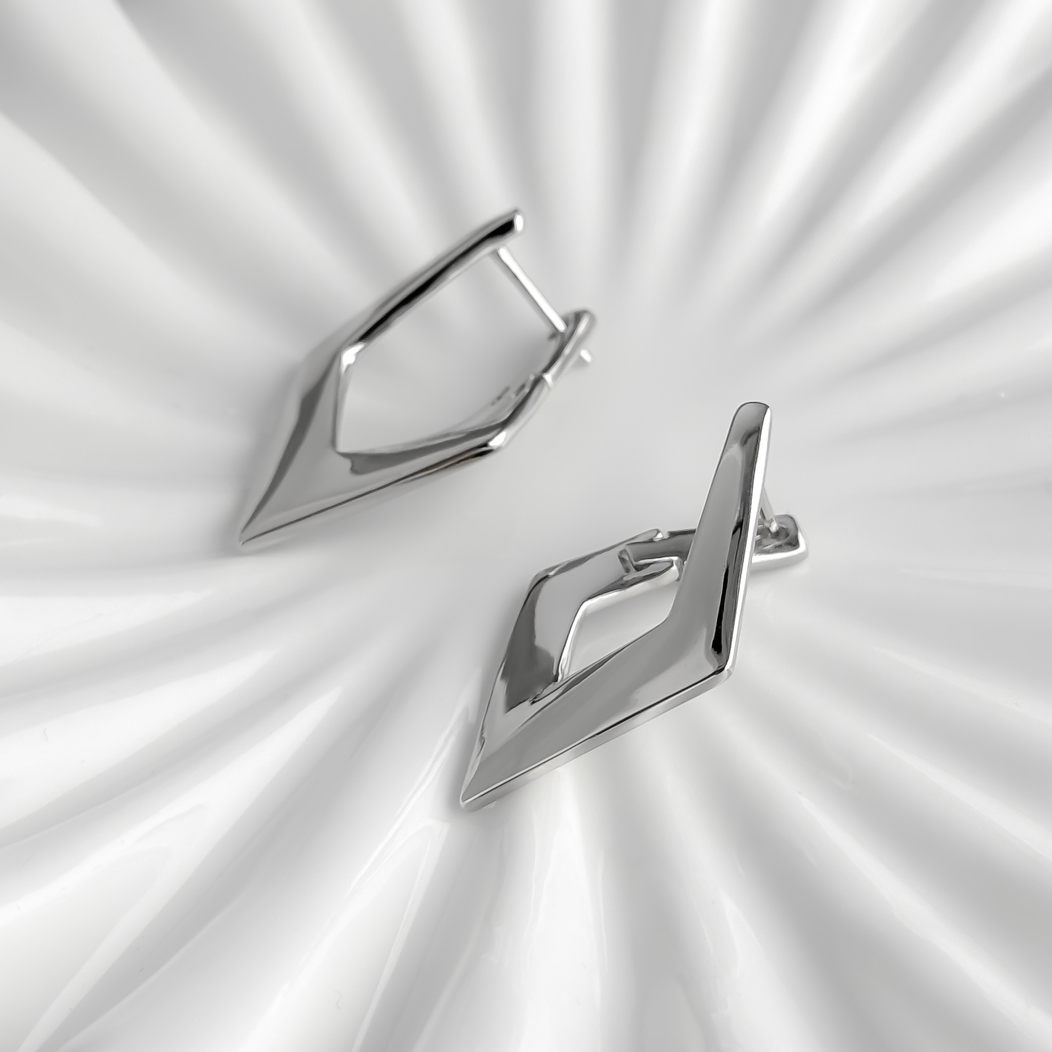 Te srebrne kolczyki o geometrycznym, ostro ciętym kształcie to biżuteria w stylu pure minimalism. Gładka, lśniąca powierzchnia i mocna linia dodają im futurystycznego charakteru. Idealne do eleganckich stylizacji, ale też świetnie przełamują casualowe outfity.