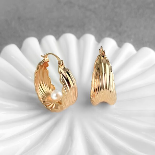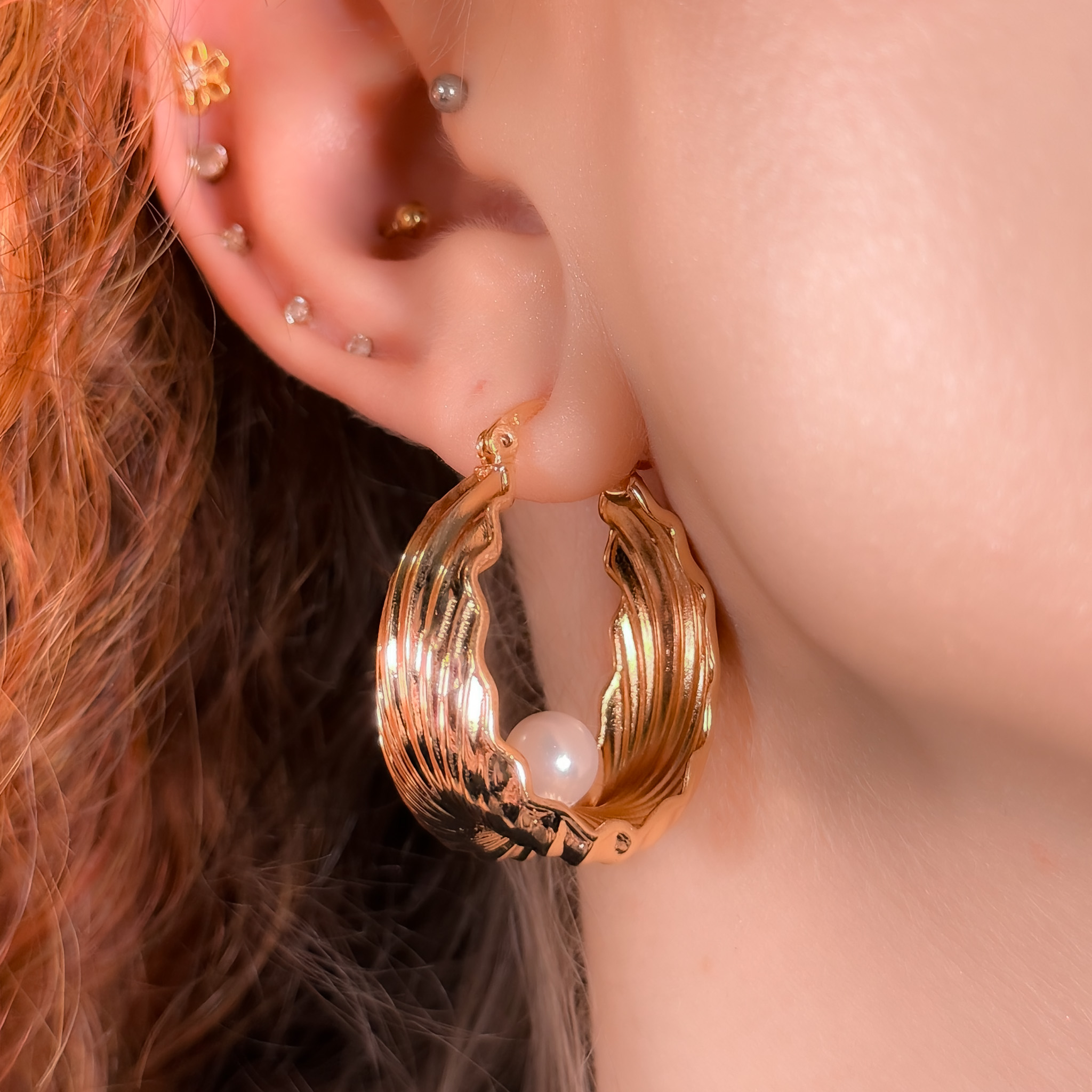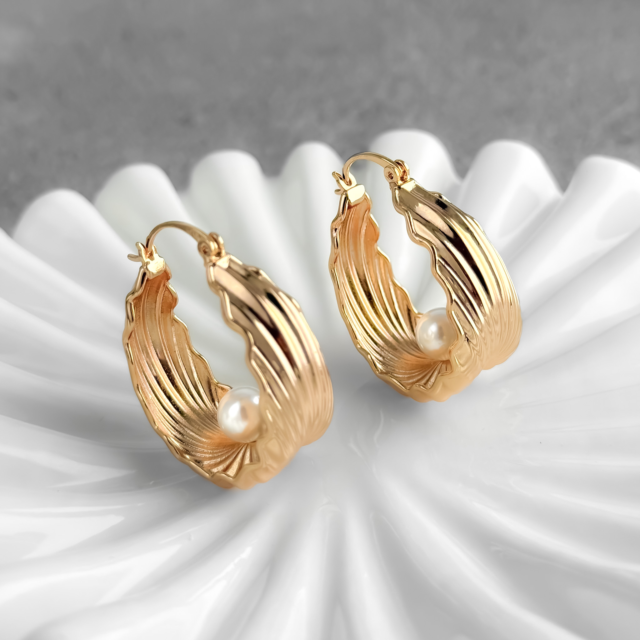 Te kolczyki wyglądają jak muszle zatrzymane w ruchu. Falujące linie złotej oprawy skrywają w środku subtelną perełkę. To biżuteria, która robi wrażenie od razu: elegancka, kobieca, ale z nutą artystycznego stylu. Idealne na specjalne okazje i do minimalistycznych stylizacji, którym chcesz dodać klasy.